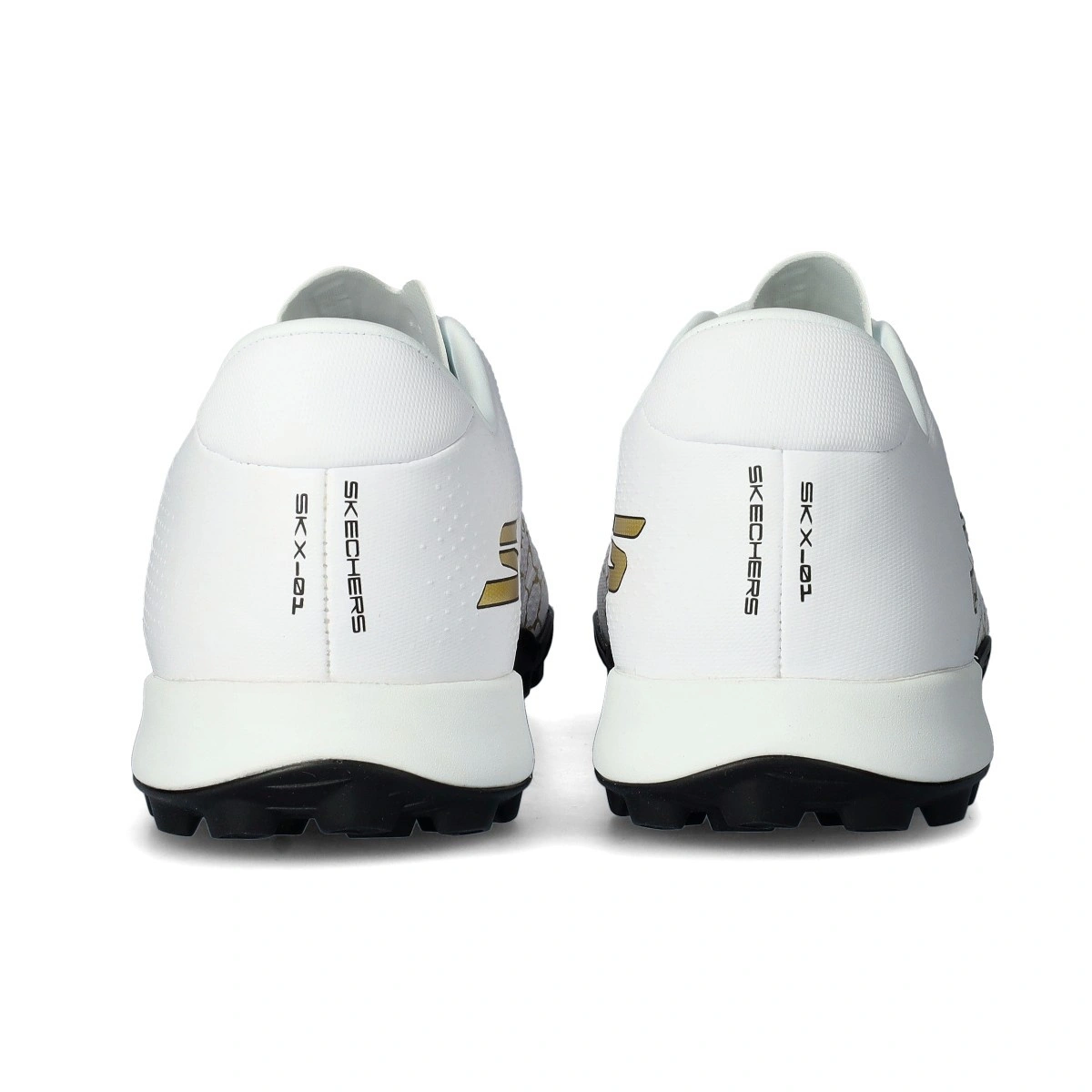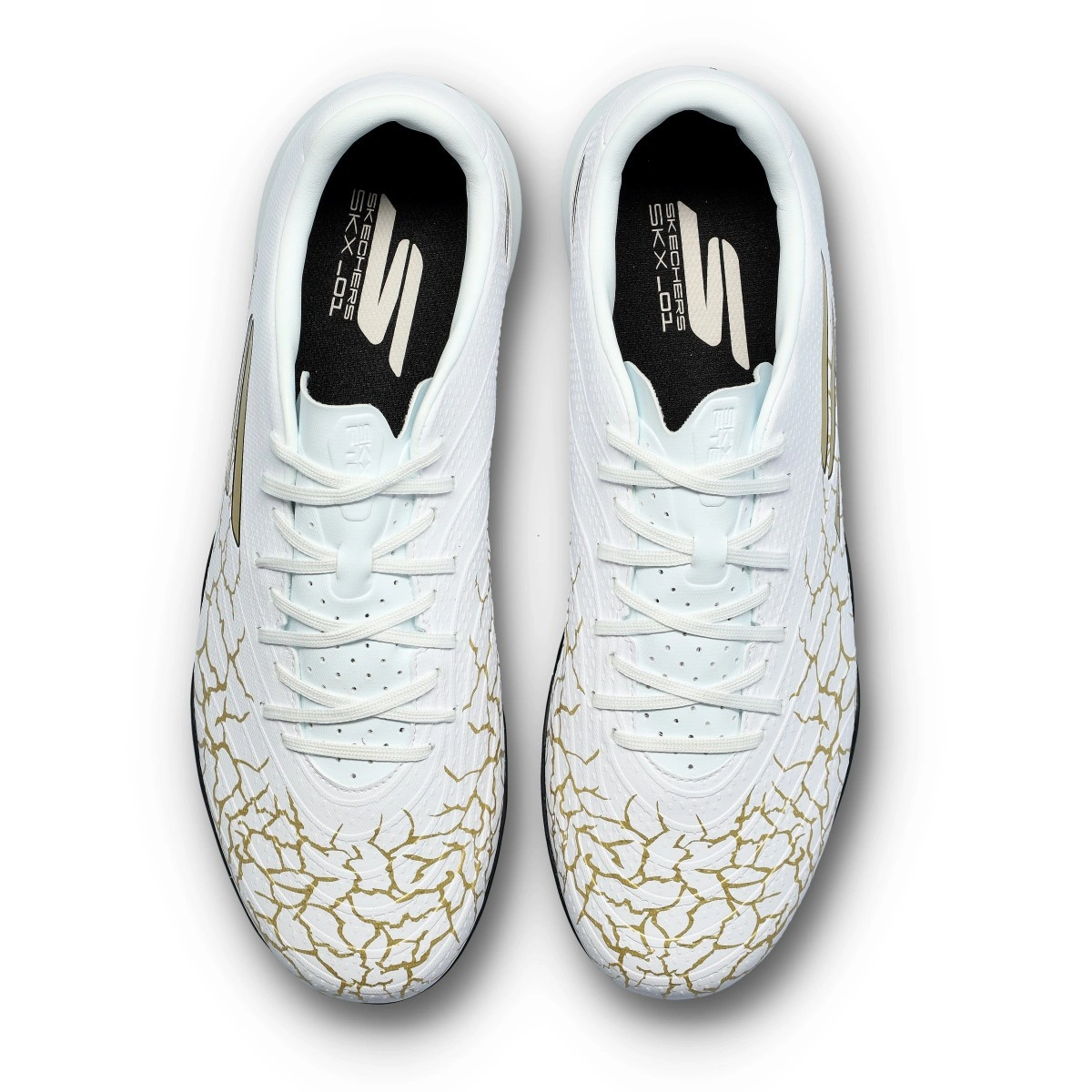 SKX_1.5 Academy Turf voetbalschoen van het merk Skechers in de kleur White-Gold voor kunstgras of kunstmatige grasvelden.