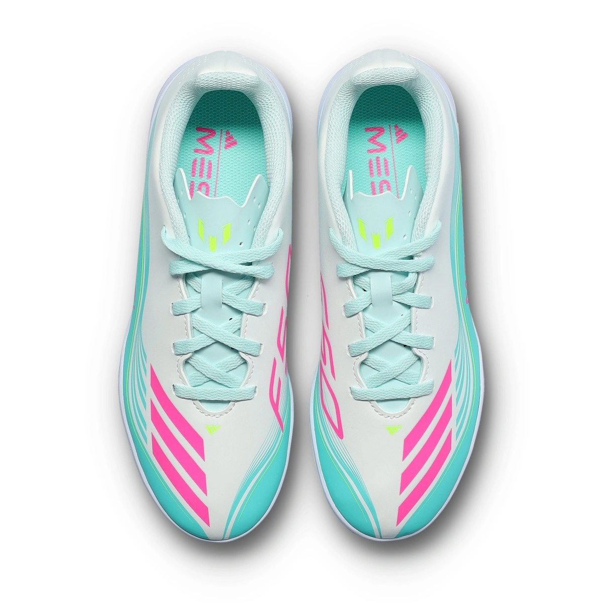 F50 Messi Club IN zaalvoetbalschoen voor kinderen van het merk adidas in de kleur White-Lucid Pink-Flash Aqua. Instapmodel zaalvoetbalschoen voor indoorvloeren.