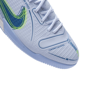 Nike Mercurial Vapor 14 Academy IC zaalvoetbalschoenen voor volwassenen. Synthetisch bovenwerk voor gebruik op indoorvloeren. Goedkope schoen in grijs-donker marineblauw-lichtblauw voor snelle spelers.