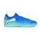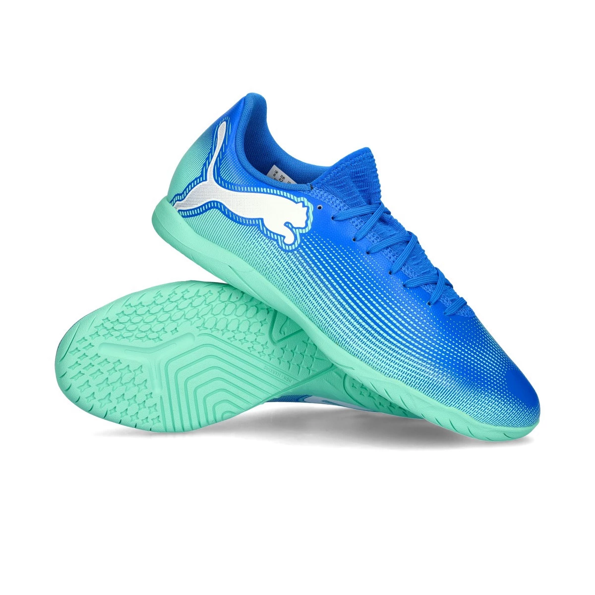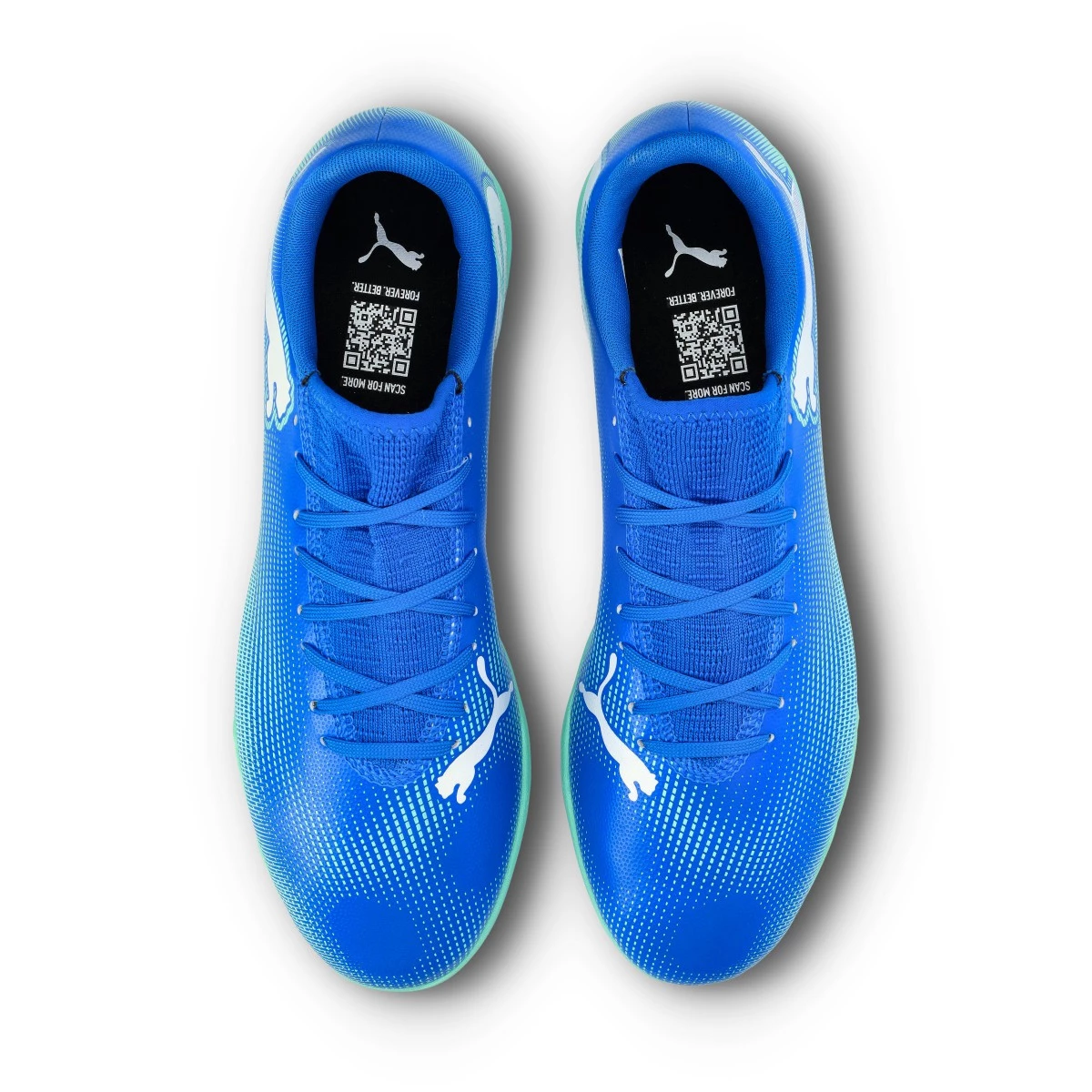 Puma Future 7 Play IT voetbalschoenen. Synthetisch voetbalschoenen voor gebruik op tapijt of kunstgras. Basisschoenen in de kleur Hyperlink Blauw-Mint-Wit.