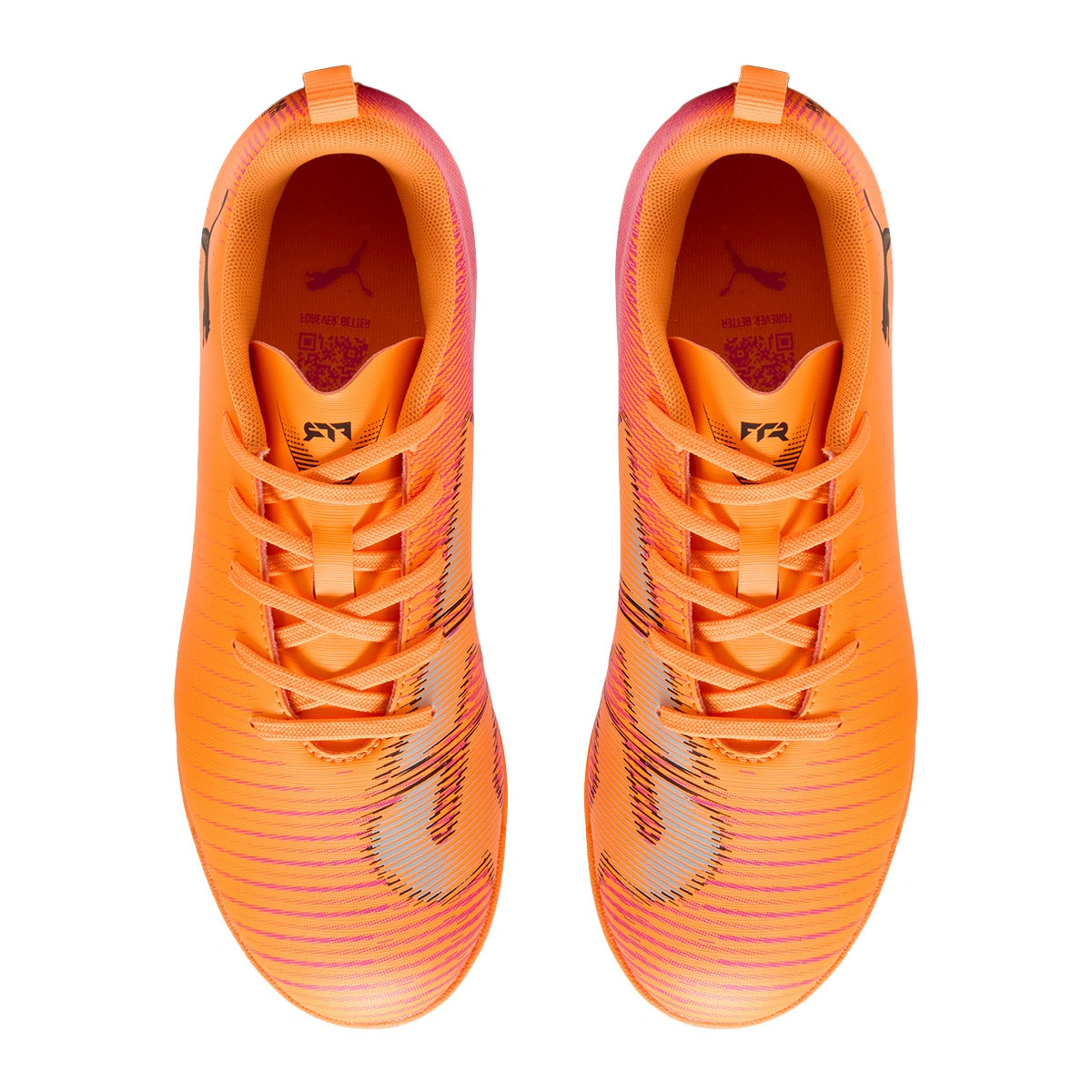 Puma Future 8 Play IT zaalvoetbalschoen met veters voor kinderen. Synthetische schoenen voor gebruik op indoorvelden. High-end schoenen in de kleur Heat Fire-Black-Ravish.
